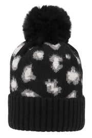 Super Soft Chunky Cashmere Hat with Pom Pom in Black Leopard