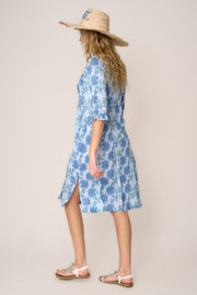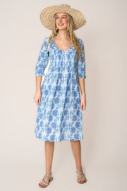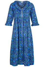 Cotton Karen 3/4 Sleeve Day Dress in Royal Blue with Blue & Green Flower