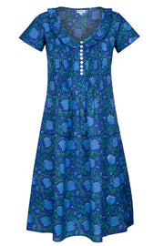 Cotton Karen Short Sleeve Day Dress in Royal Blue with Blue & Green Flower