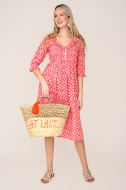 Cotton Karen 3/4 Sleeve Day Dress in Coral & White Flower