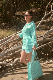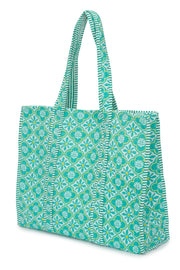 Medium Cotton Tote Bag In Turquoise & White Flower